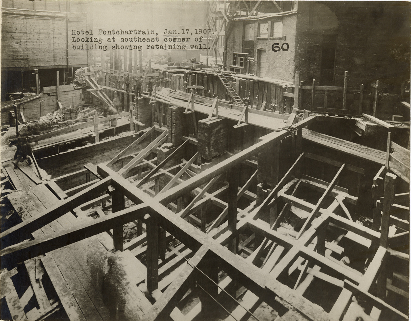 View of Hotel Pontchartrain during construction, showing retaining wall. Typed on front: "Hotel Pontchartrain, Jan. 17, 1907. Looking at southeast corner of building showing retaining wall." Stamped on back: "W.D. Benham, commercial photographer, 414 Wetherbee Bldg., Detroit, Mich."