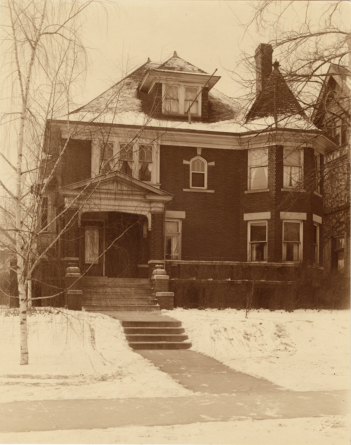 View of the Oscar B. Marx residence. Two-story brick house has turret, roof dormer and covered entry porch. Handwritten on back: "Home of Mayor Oscar B. Marx."