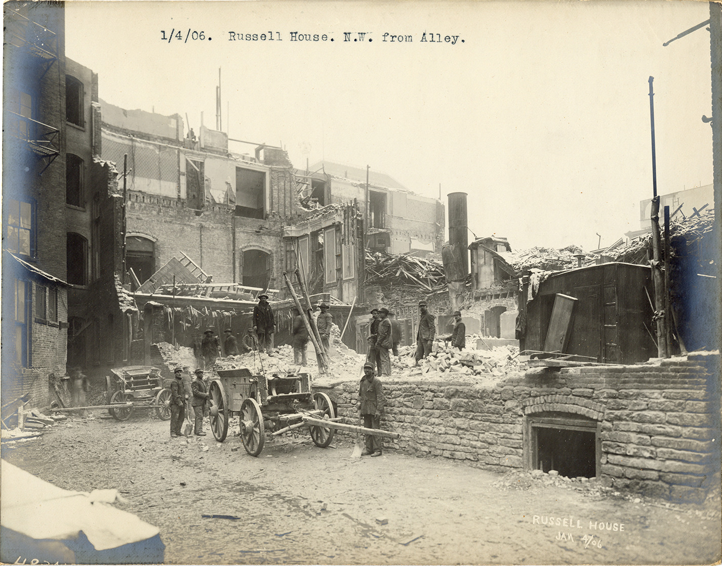 View of construction workers posing in front of partially demolished Russell House. Wagon in foreground. The Russell House closed on November 19, 1905, was subsequently demolished and replaced by the Pontchartrain Hotel. Typed on front: "1/4/06. Russell House. N.W. from alley." Printed on front: "Russell House, Jan 4/06."