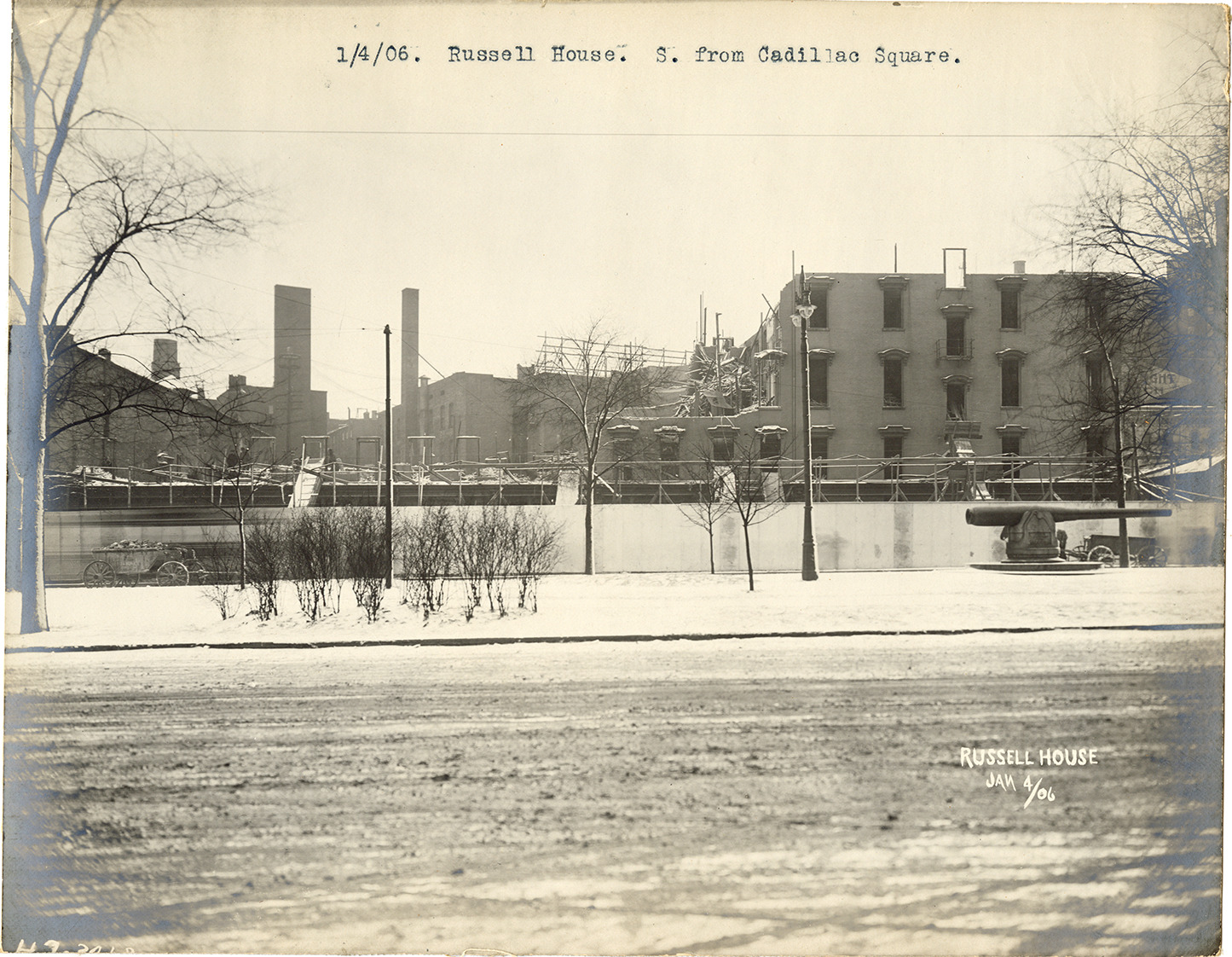 View of the Russell House during demolition. Cannon in foreground. The Russell House closed on November 19, 1905, was subsequently demolished and replaced by the Pontchartrain Hotel. Typed on front: "1/4/06. Russell House. S. from Cadillac Square." Printed on front: "Russell House, Jan 4/06."