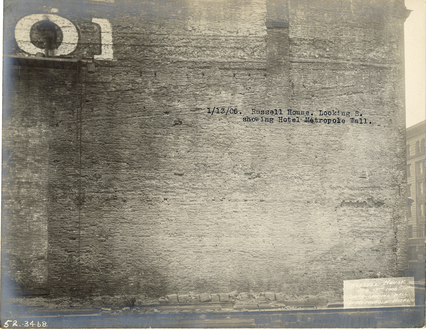 View of the Hotel Metropole brick wall, Russell House during demolition. The Russell House closed on November 19, 1905, was subsequently demolished and replaced by the Pontchartrain Hotel. Typed on front: "1/13/06. Russell House looking S. showing Hotel Metropole wall." Printed on front: "Russell House, Jan. 13th, 1906. South, showing wall of Metropole Hotel."