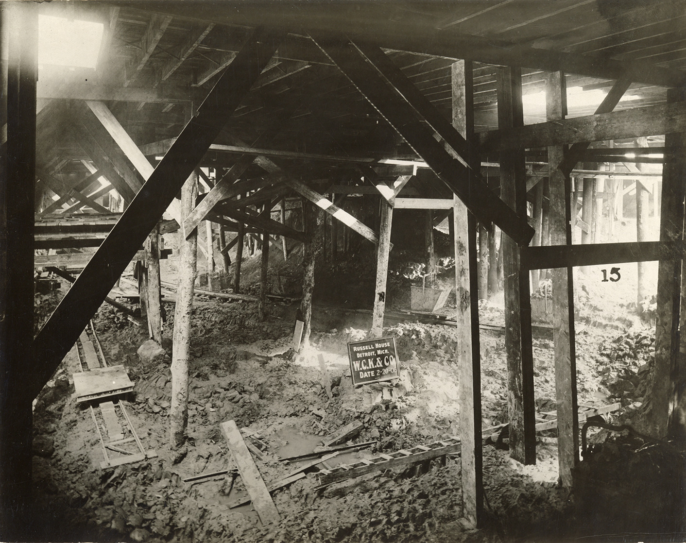 View of the Russell House during demolition. "Russell House, Detroit, Mich. W.C.K. & Co., date 2-20-06" sign in foreground. The Russell House closed on November 19, 1905, was subsequently demolished and replaced by the Pontchartrain Hotel. Stamped on back: "W.D. Benham, commercial photographer, 414 Wetherbee Bldg., Detroit, Mich."