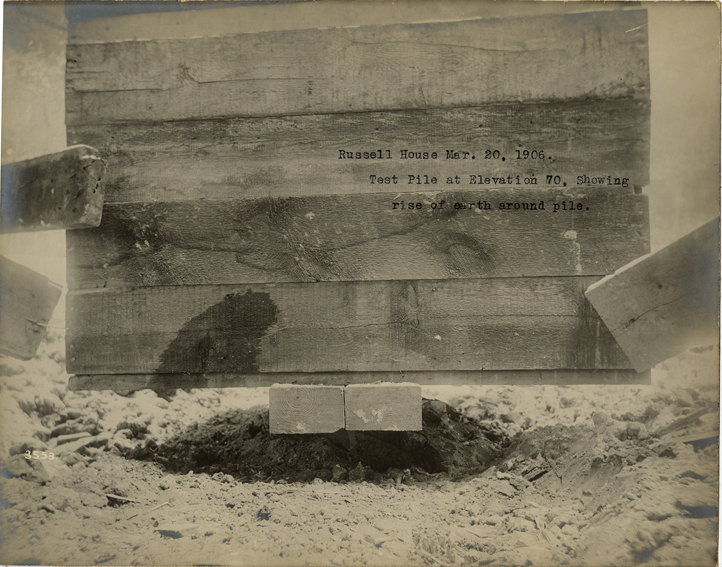 View of a test pile, Russell House during demolition. The Russell House closed on November 19, 1905, was subsequently demolished and replaced by the Pontchartrain Hotel. Typed on front: "Russell House, Mar. 20, 1906. Test pile at elevation 70, showing rise of earth around pile."