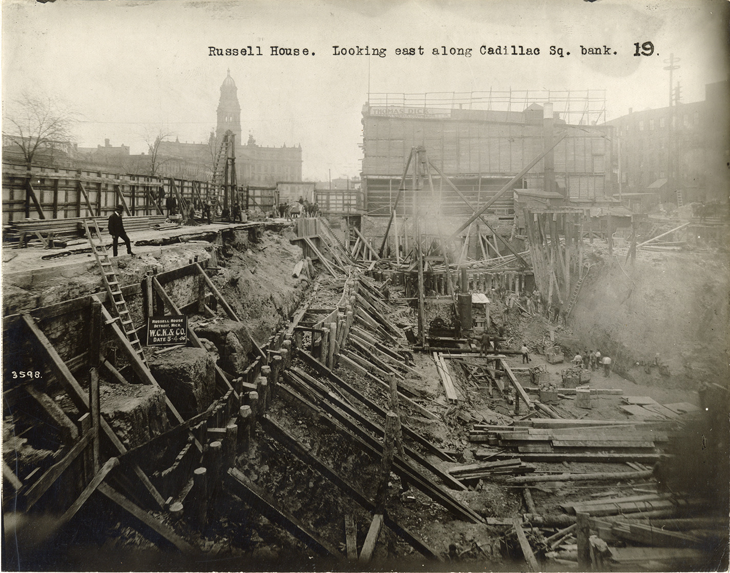 View of the Russell House during demolition. "Russell House, Detroit, Mich. W.C.K. & Co., date 5-4-06" sign on left. The Russell House closed on November 19, 1905, was subsequently demolished and replaced by the Pontchartrain Hotel. Typed on front: "Russell House. Looking east along Cadillac Sq. bank." Stamped on back: "W.D. Benham, commercial photographer, 414 Wetherbee Bldg., Detroit, Mich."