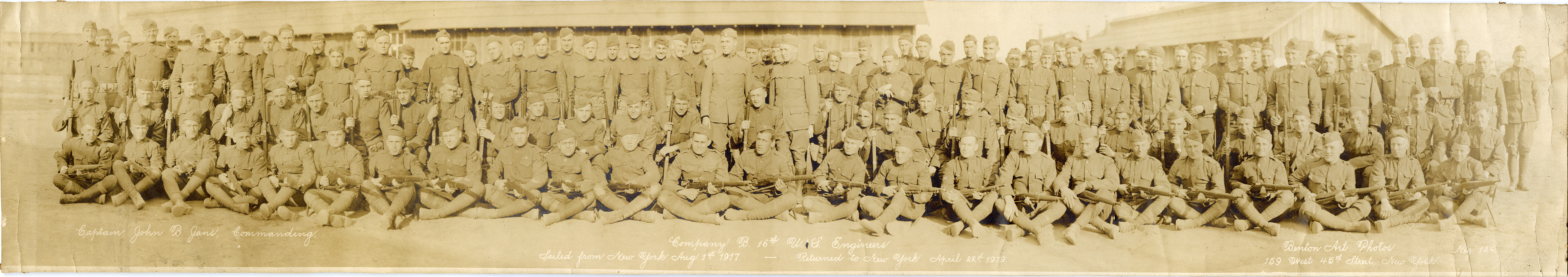 Group portrait of Company B, 16th Regiment of Railway Engineers, U.S. Army. Printed on front: "Captain John B. Jans, Commanding. Company B. 16th U.S. Engineers. Sailed from New York Aug. 1st, 1917. Returned to New York, April 22nd, 1919. Benton Art Photos. 159 West 45th Street, New York. Neg. 124."