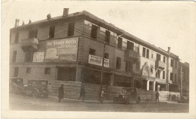View of the Savoy Hotel. Cars parked along curb. Sign on building reads: "All material of this building for sale, Joyce Wrecking Company."