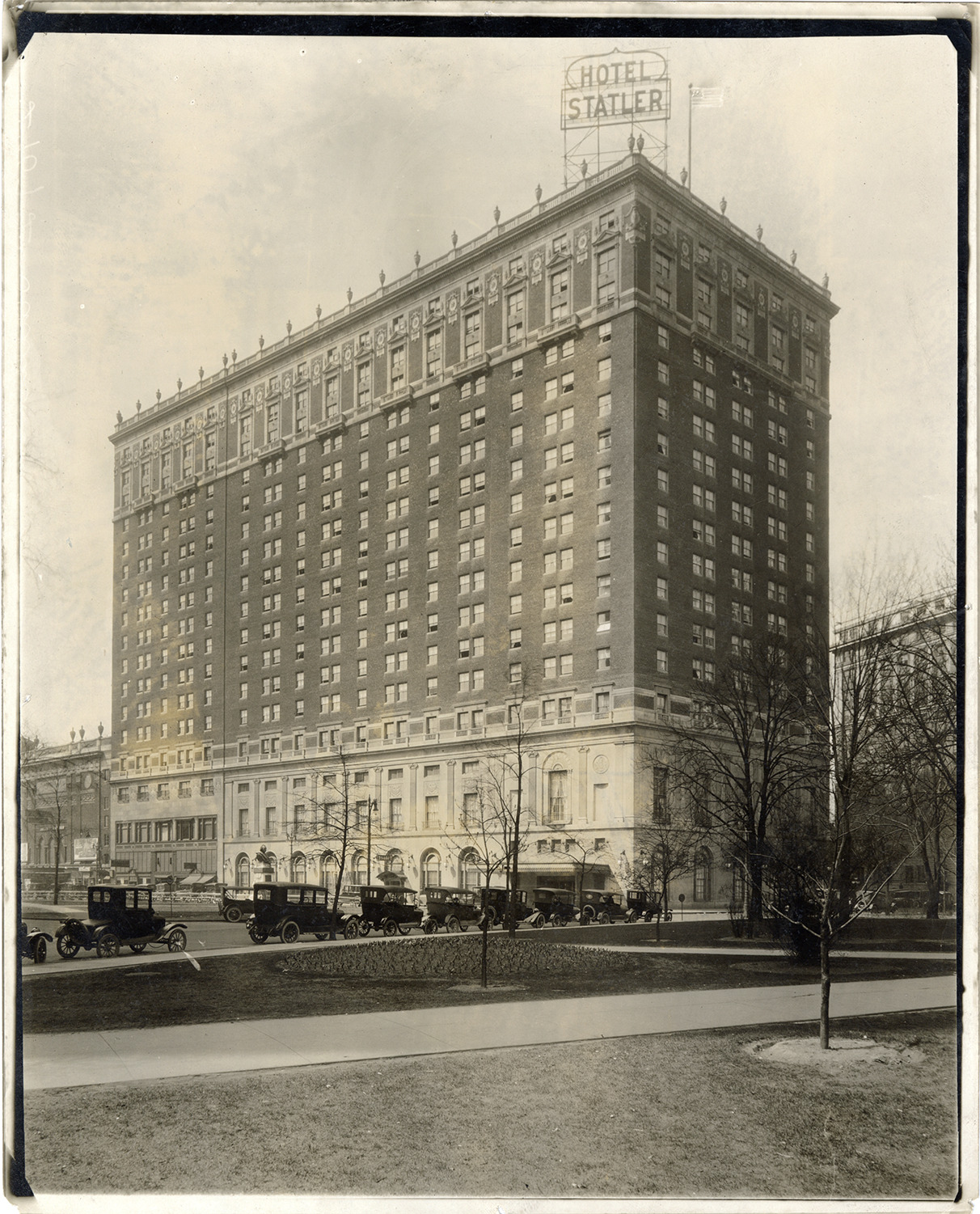 View of the Hotel Statler. Cars parked along curb. Stamped on back: "Manning Bros., commercial photographers, 22-24 Witherell St., Detroit, Michigan." Handwritten on back: "The Statler Hotel."