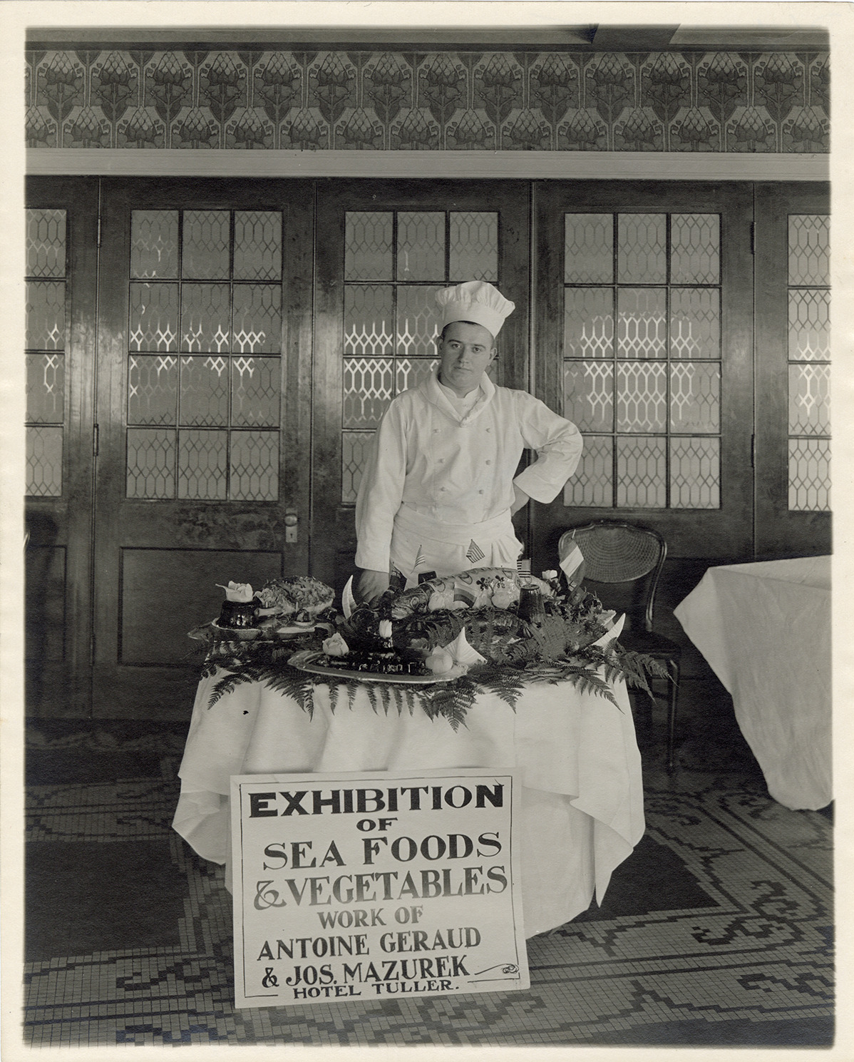 View of chef Antoine Geraud posing with a display of seafood and vegetables at the Hotel Tuller. Sign in front of table reads: "Exhibition of sea foods & vegetables, work of Antoine Geraud & Jos. Mazurek, Hotel Tuller."