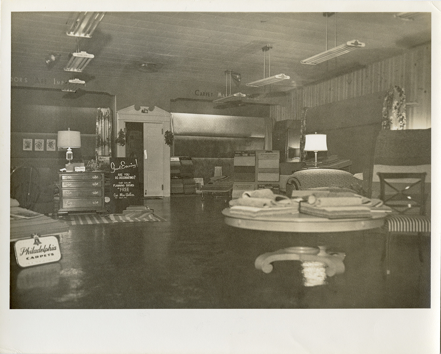 Interior view of the Owens Co. carpet store, located at 20525 Mack in Grosse Pointe, Michigan. Carpets samples and furniture in room. Table with samples in foreground; sign in background reads: "Good evening! Are you re-decorating? Our color planning service is free. Ask Mrs. Walker to help you."