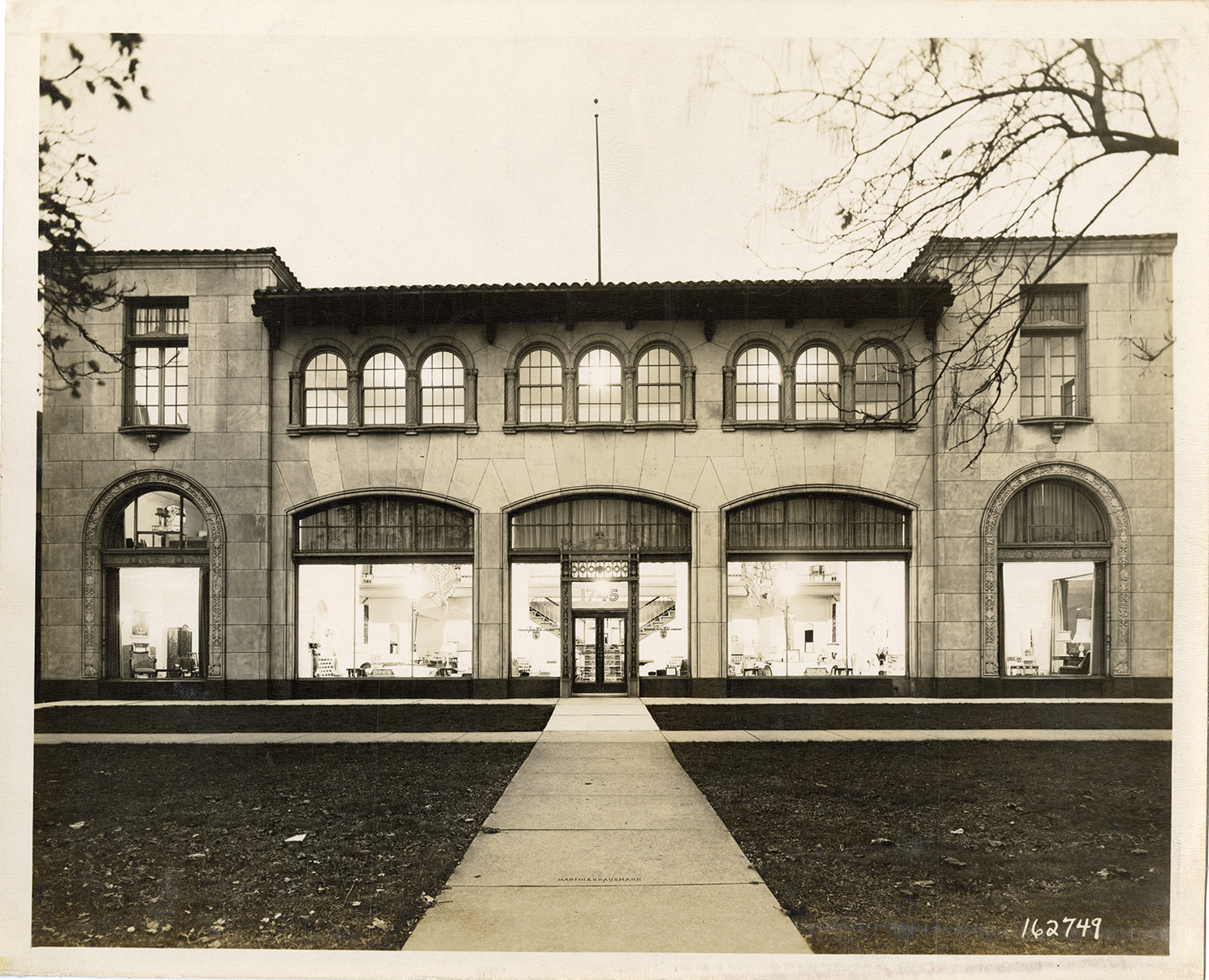 View of the Edmund-Clark Furniture Co., located at 1745 East Grand Boulevard. The Spanish Eclectic style building was designed by Arthur Kiel. Stamped on back: "Manning Bros., commercial photographers, 16300 Brush Street (block south of 6 Mile), Highland Park 3, Mich."