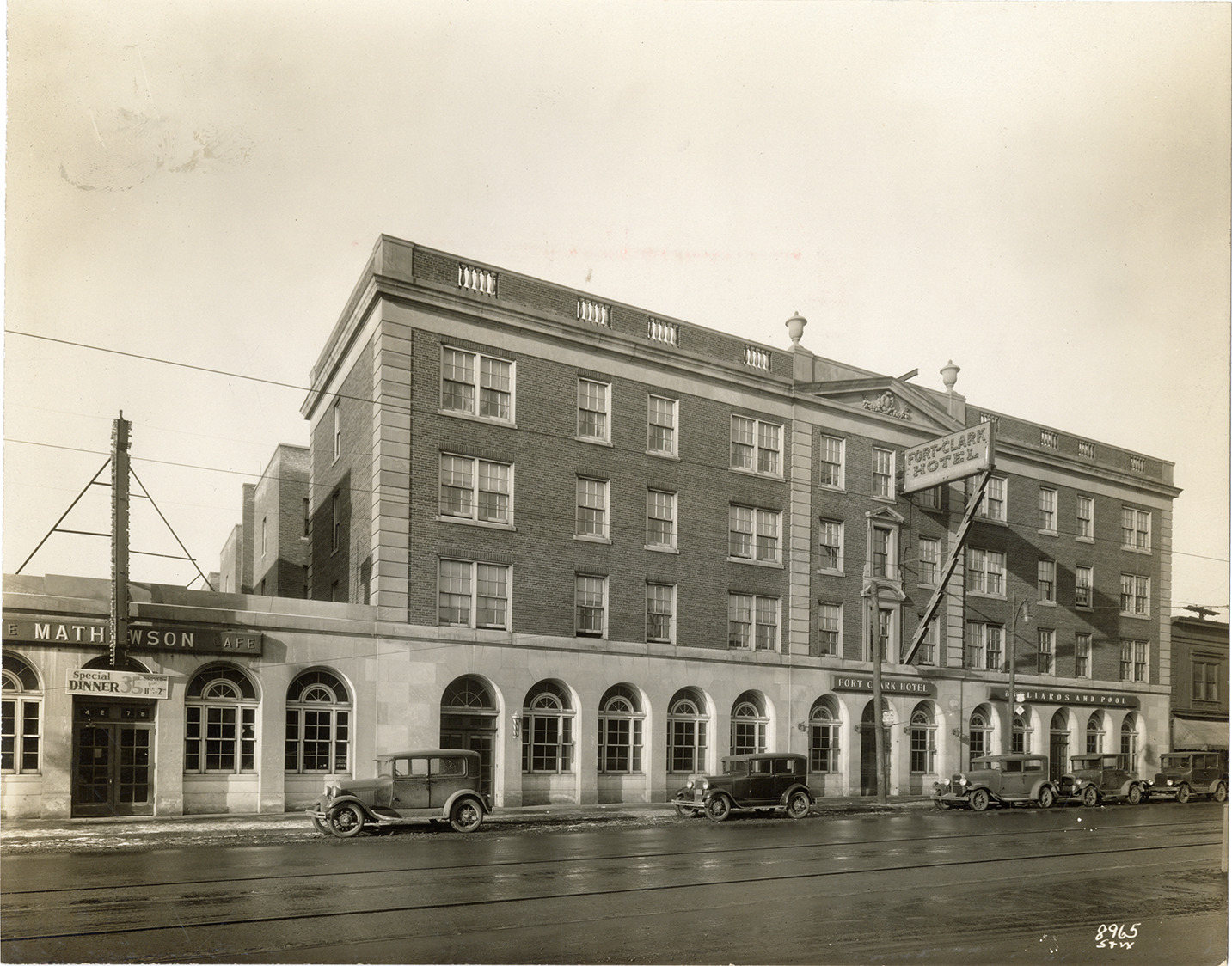 View of the Fort-Clark Hotel. Cars are parked along curb in front of building. Mathewson Cafe on left with sign reading: "Special dinner, 35 [cents] served from 11 a.m. to 2 p.m." Label on back: "Fort Clark Hotel, cor. Fort & Clark Sts., 307 rooms, 35 baths. 1 #150 Johanson heater."