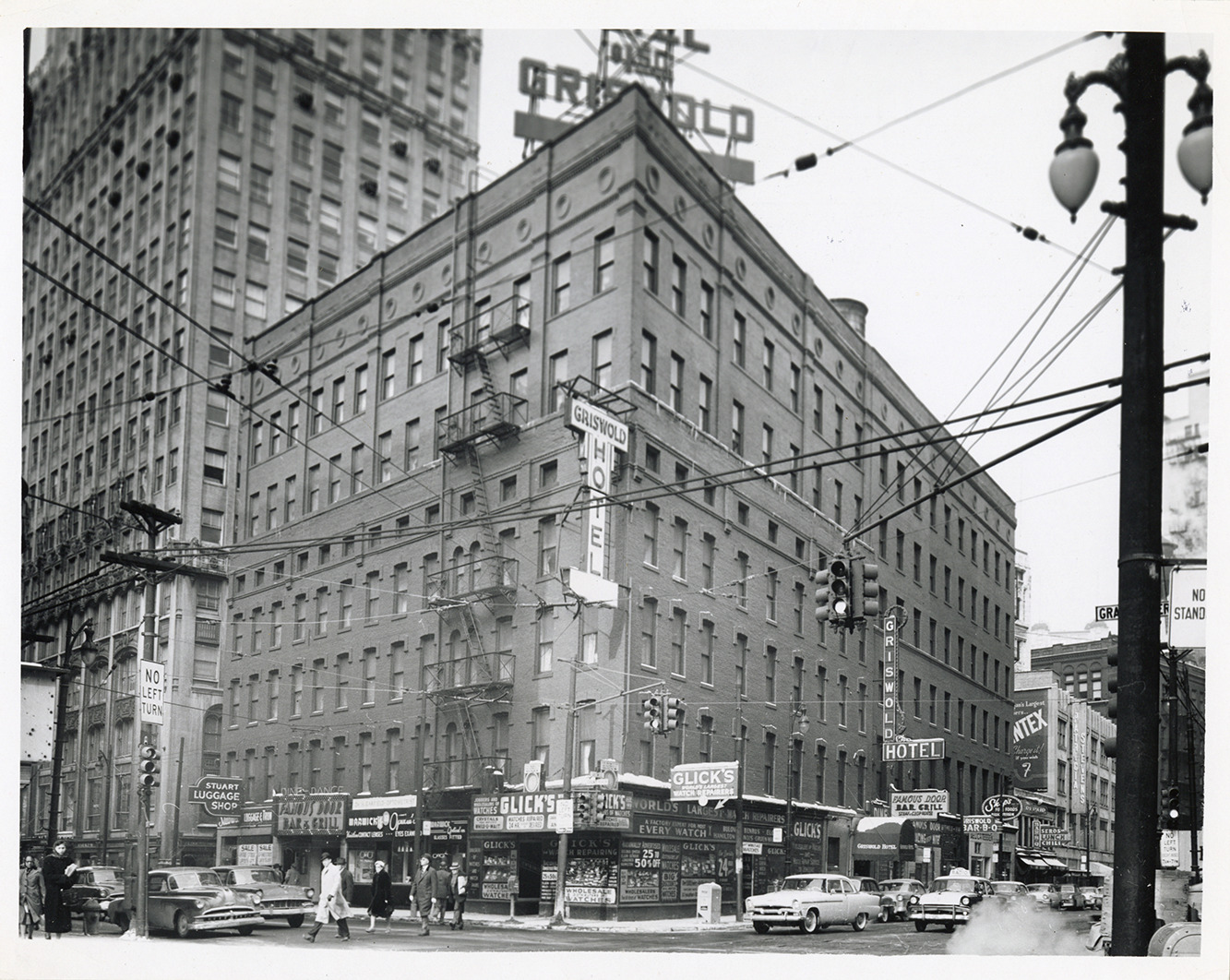 View of the Griswold Hotel, located at Griswold and Grand River Ave. Cars and taxi in street. Businesses on ground level include Glick's, Stuart Luggage Shop, Famous Door Bar & Grill and Griswold Bar-B-Q. Stamped on back: "Feb 10 1957."