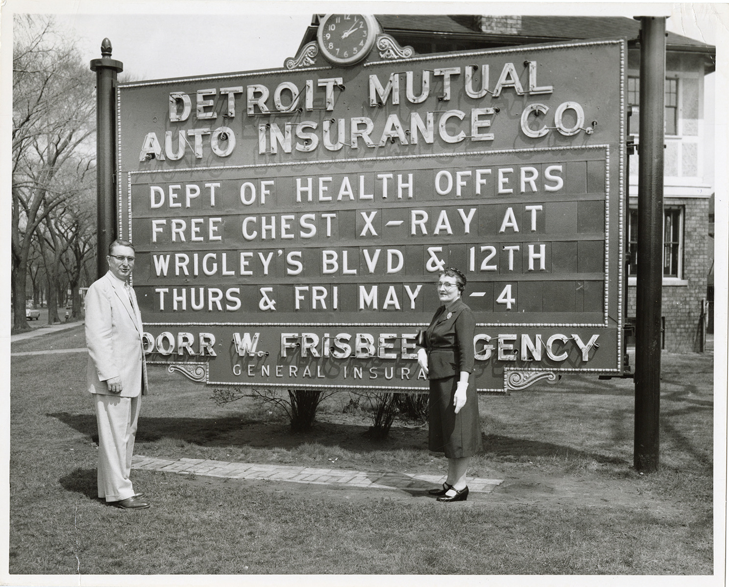 View of a man and woman posing in front of a Detroit Mutual Auto Insurance Co. sign advertising free chest x-rays offered by the Detroit Department of Health. Clock is displayed above sign. Sign reads: "Detroit Mutual Auto Insurance Co. Dept. of Health offers free chest x-ray at Wrigley's Blvd. & 12th, Thurs. & Fri May [?]-4. Dorr W. Frisbee Agency, general insurance."
