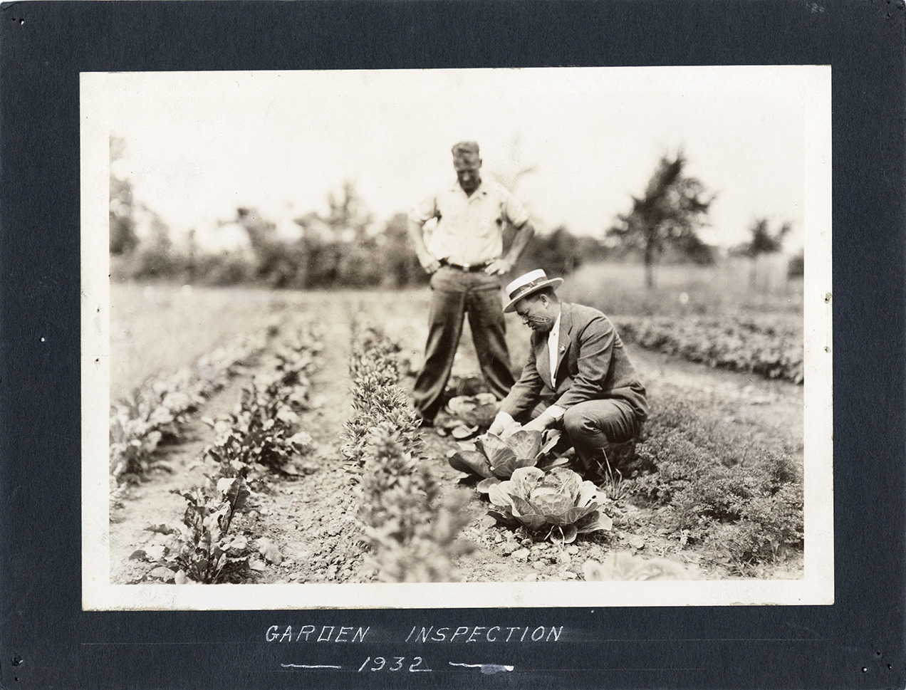 View of a man examining cabbages during a garden inspection at the Detroit Thrift Gardens. Handwritten on front: "Garden inspection, 1932."