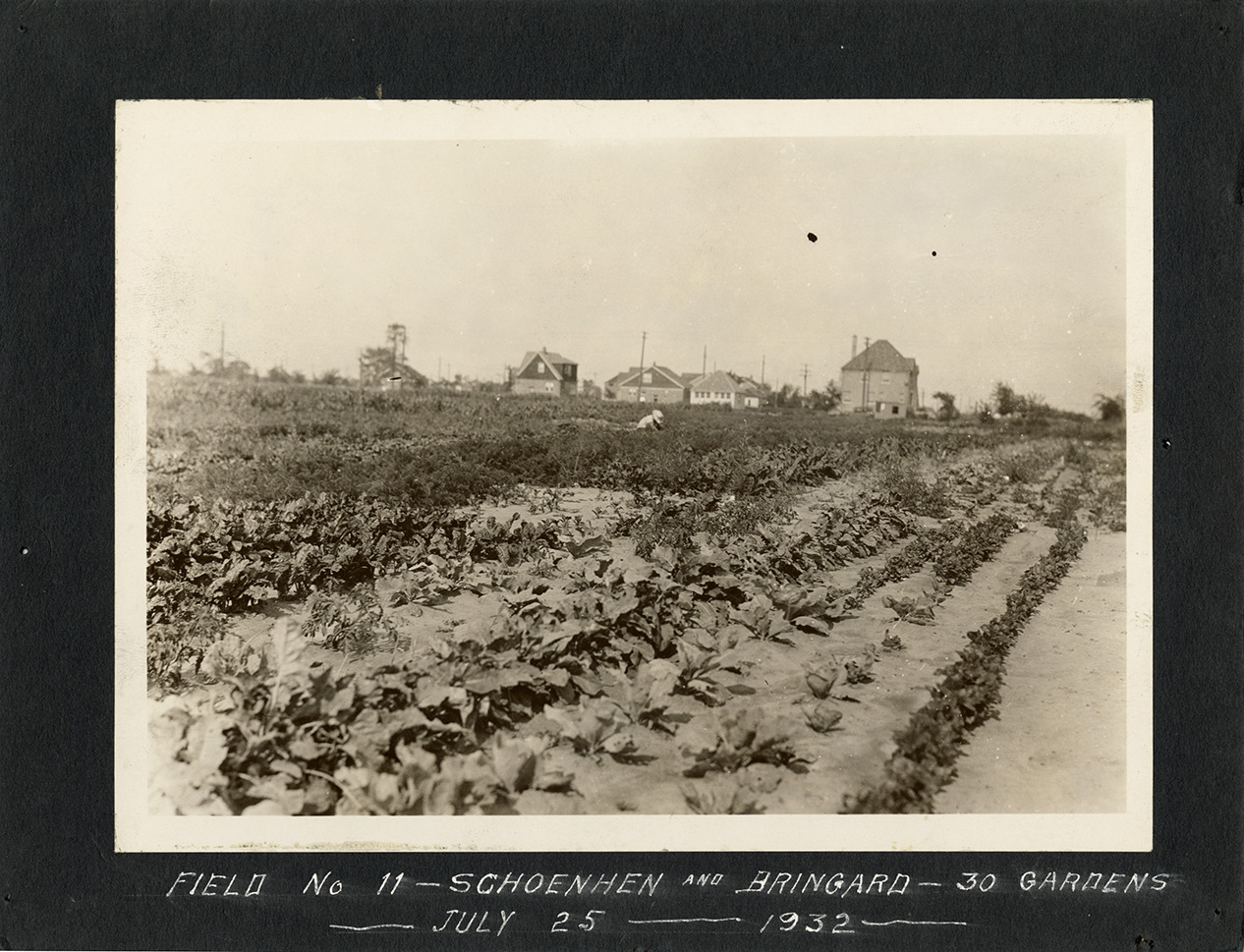 View of a man working in Field No. 11 at the Detroit Thrift Gardens. Handwritten on front: "Field No. 11, Schoenhen [sic, should be Schoenherr] and Bringard, 30 gardens. July 25, 1932."