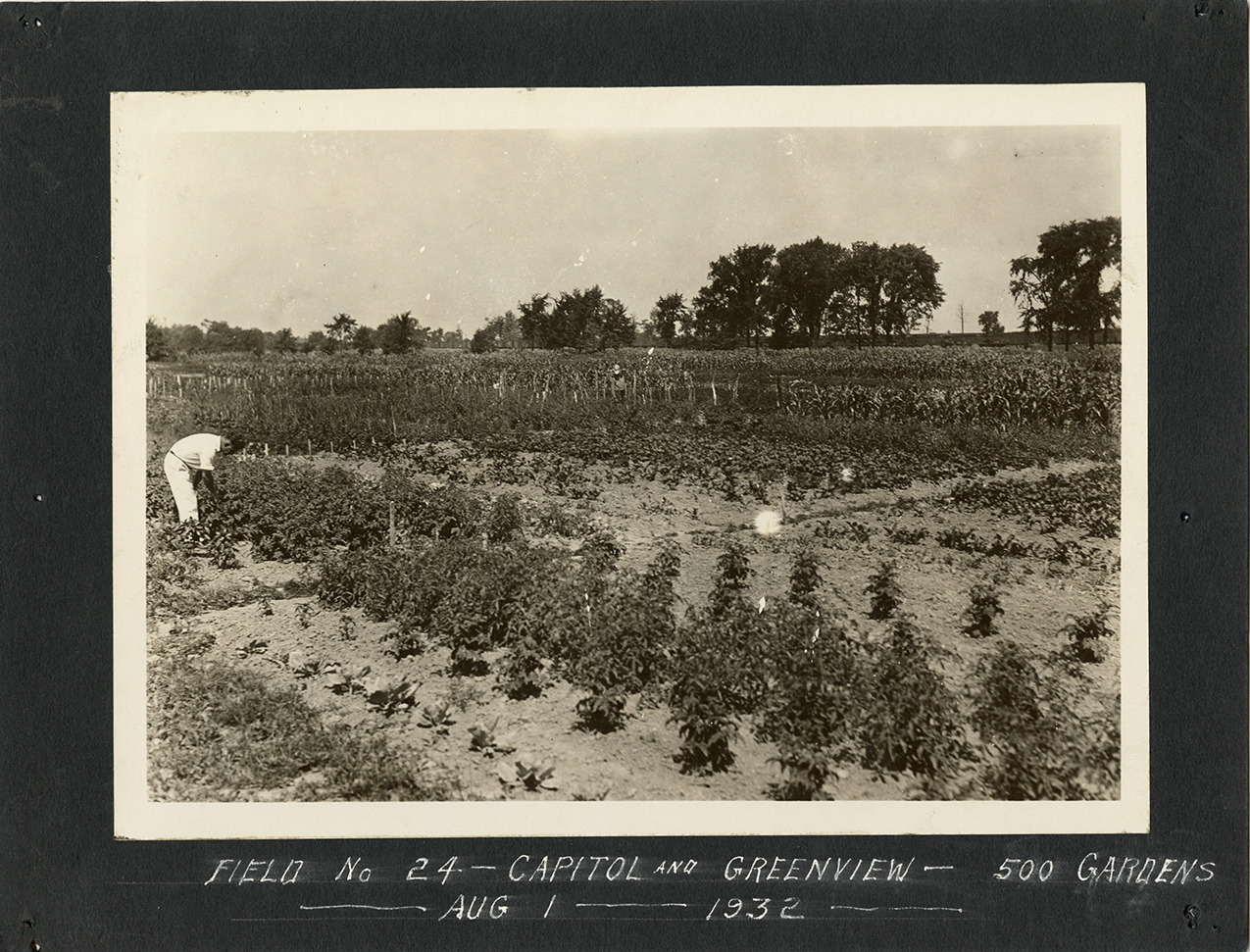 Favorite this☆ Man working in Field No. 24, Detroit Thrift Gardens Description: View of a man working in Field No. 24 at the Detroit Thrift Gardens. Handwritten on front: "Field No. 24, Capitol and Greenview, 500 gardens. Aug. 1, 1932." Details Resource ID: bh029613 Subject: Detroit Thrift Gardens Vegetable gardening--Michigan--Detroit Detroit (Mich.). Mayor's Unemployment Relief Committee. Detroit Thrift Gardens Photographic prints Date Issued: 1932-08-01 Format: 1 photographic print mounted on stock ; image 5 x 7 in. Member of: Burton Historical Collection Filing Location: D/Gardens-Detroit Thrift Rights: Physical rights are retained by DPL. Copyright is retained in accordance with U.S. copyright laws.