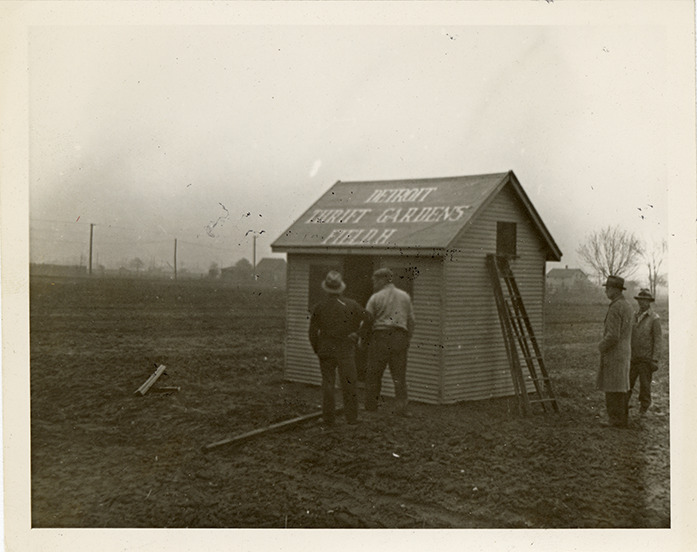 Favorite this☆ Shed in Field H, Detroit Thrift Gardens Description: View of four men gathered around a shed in Field H, Detroit Thrift Gardens. "Detroit Thrift Gardens, Field H" is lettered on roof. Details Resource ID: bh029634 Subject: Sheds--Michigan--Detroit Detroit Thrift Gardens Vegetable gardening--Michigan--Detroit Detroit (Mich.). Mayor's Unemployment Relief Committee. Detroit Thrift Gardens Photographic prints Date Issued: Unknown year Format: 1 photographic print ; 3.75 x 4.75 in. Member of: Burton Historical Collection Filing Location: D/Gardens-Detroit Thrift Rights: Physical rights are retained by DPL. Copyright is retained in accordance with U.S. copyright laws.