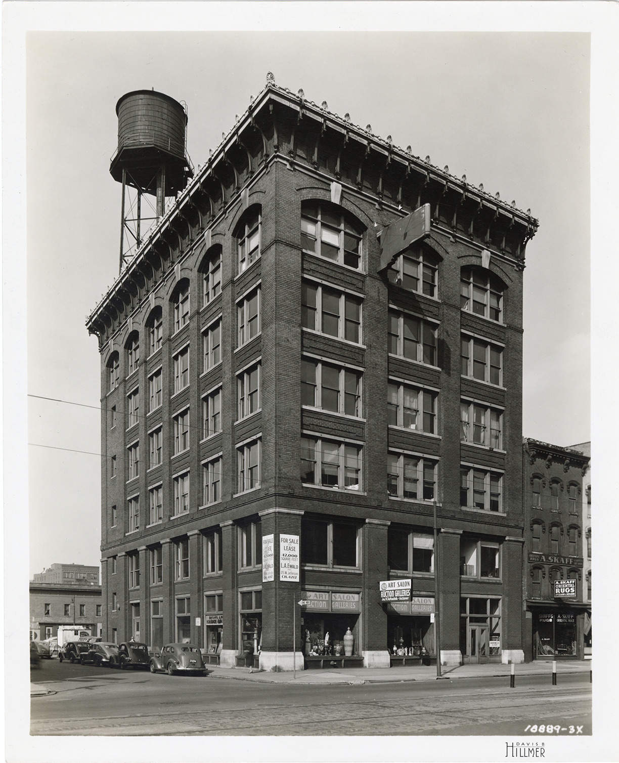 View of the Joseph N. DuMouchelle auction house. Brick Italianate style building is located on Jefferson Avenue. Printed on front: "Davis B. Hillmer." Stamped on back: "Davis B. Hillmer, commercial photography, 8825 Second Ave., Detroit 2, Michigan. TR 5-7620, TR 2-8000." Handwritten on back: "409 E. Jefferson, Detroit, Oct. 1943."