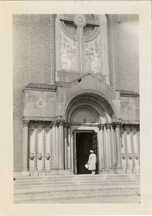 View of woman entering the St. Thomas the Apostle Catholic Church. Handwritten on back: "St. Thomas the Apostle. Columns around sanctuary form narrow aisle, framing windows & no clerestory in sanct. Dome of sanctuary in tapered coffers, blue & gold rosettes in architrave. Stations set in, sculptured, in wide carved frames. Main altar low, white with blue & silver panels. Section of half dome of sanctuary to show tapering."