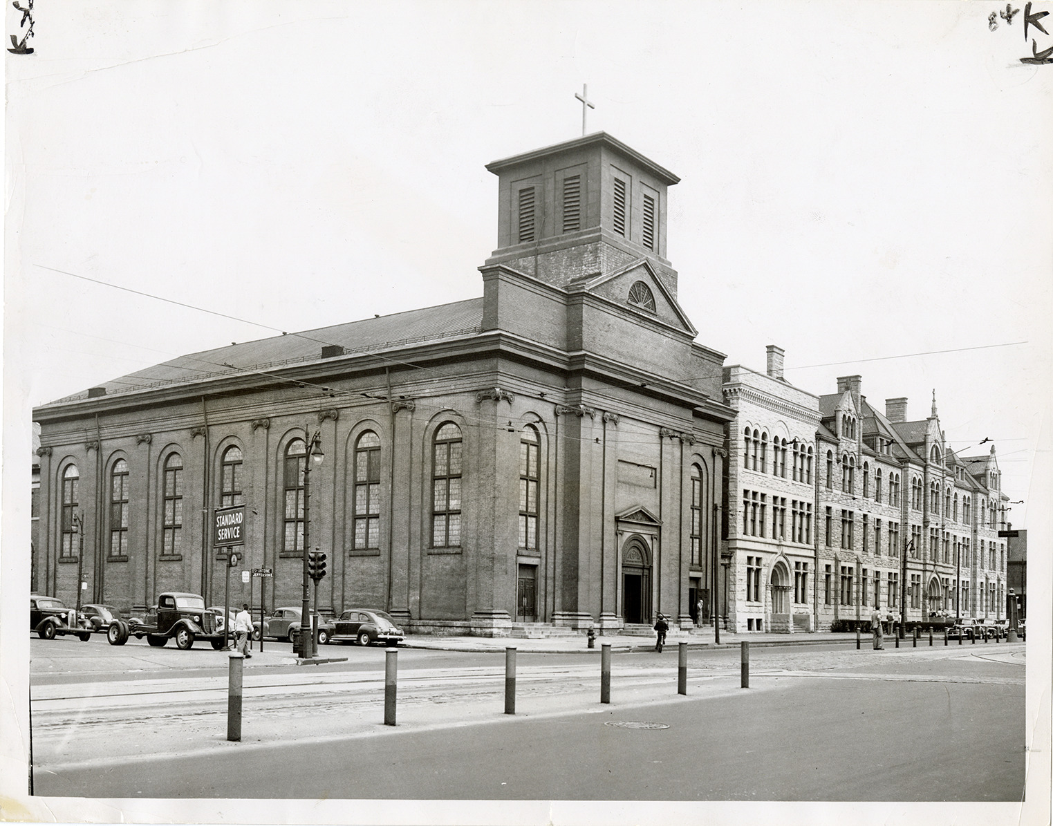 View of the SS. Peter and Paul Jesuit Church. Clipping on back: "Century of service for SS Peter and Paul's Jesuit Church will be completed June 29. The big, four-square Catholic church at St. Antoine and E. Jefferson was built to endure. It has stood through the regimes of all Detroit bishops and has offered religious consolation in every war except the Revolution."