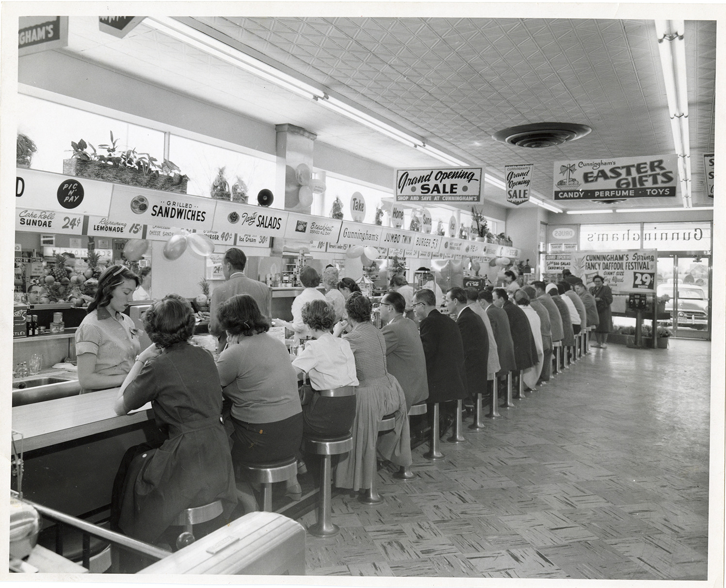View of men and women sitting at lunch counter or soda fountain at Cunningham's drugstore. Waitress behind counter. Signs overhead read: "Grand opening sale" and "Cunningham's Easter gifts, candy, perfume, toys."