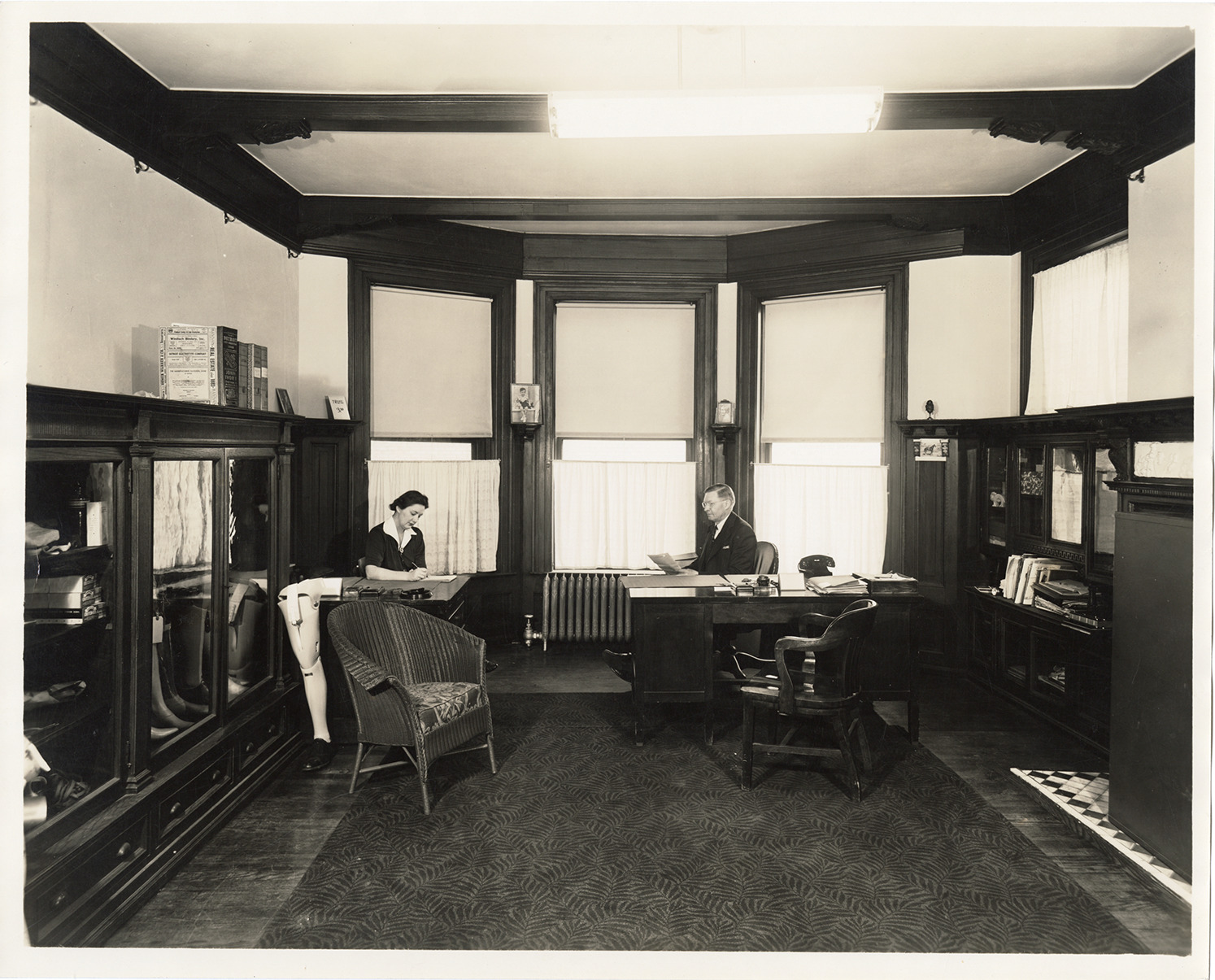 Favorite this☆ Office, E.H. Rowley Co. Description: Interior view of an office at the E.H. Rowley Co. medical supplies store. Room is furnished with desks, cabinets and chairs. Secretary takes dictation from man working at desk. Handwritten on back: "Detroit, 1940-41." Details Resource ID: bh029739 Subject: Medical supplies industry--Michigan--Detroit Medical supplies--Michigan--Detroit Artificial limbs--Michigan--Detroit Offices--Michigan--Detroit Photographic prints Date Issued: 1940 to 1941 Format: 1 photographic print ; 8 x 10 in. Member of: Burton Historical Collection Filing Location: D/Industries and business houses-Rowley (E.H.) Co. Rights: Physical rights are retained by DPL. Copyright is retained in accordance with U.S. copyright laws.