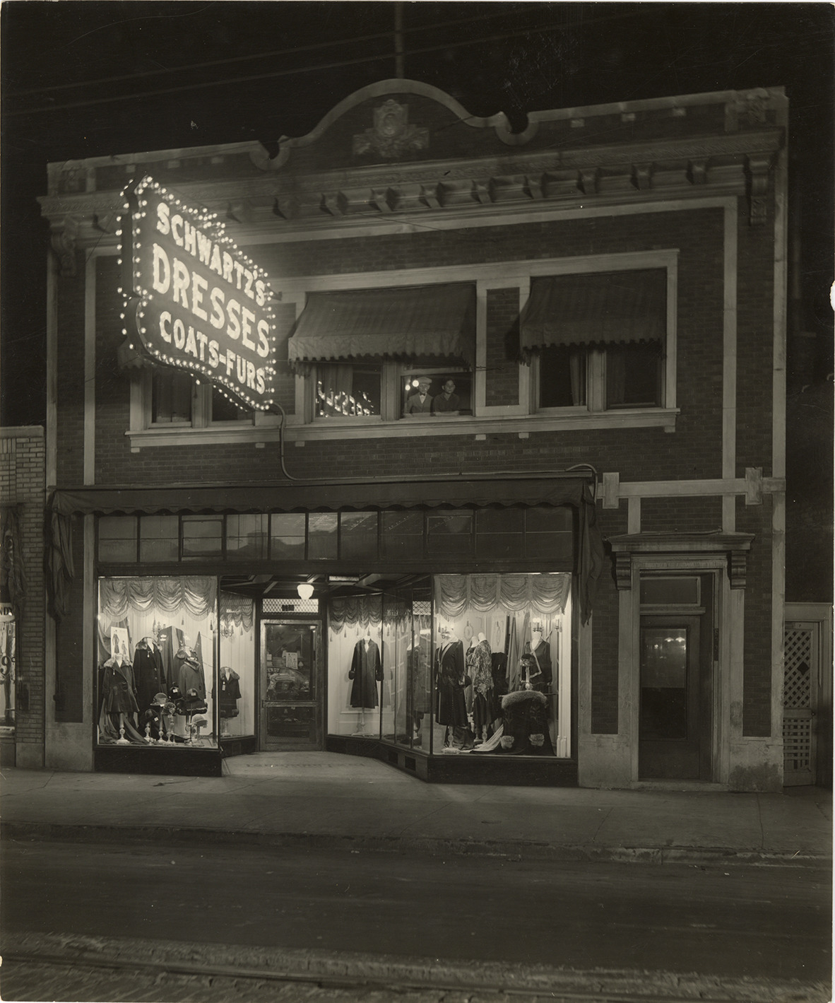 Nighttime view of Schwartz's clothing store. Display window features mannequins wearing coats and dresses. Electric sign reads: "Schwartz's dresses, coats, furs." Stamped on back: "Davis B. Hillmer, commercial photography, 8825 Second Ave., Detroit 2, Michigan. TR 5-7620. TR 2-8000."