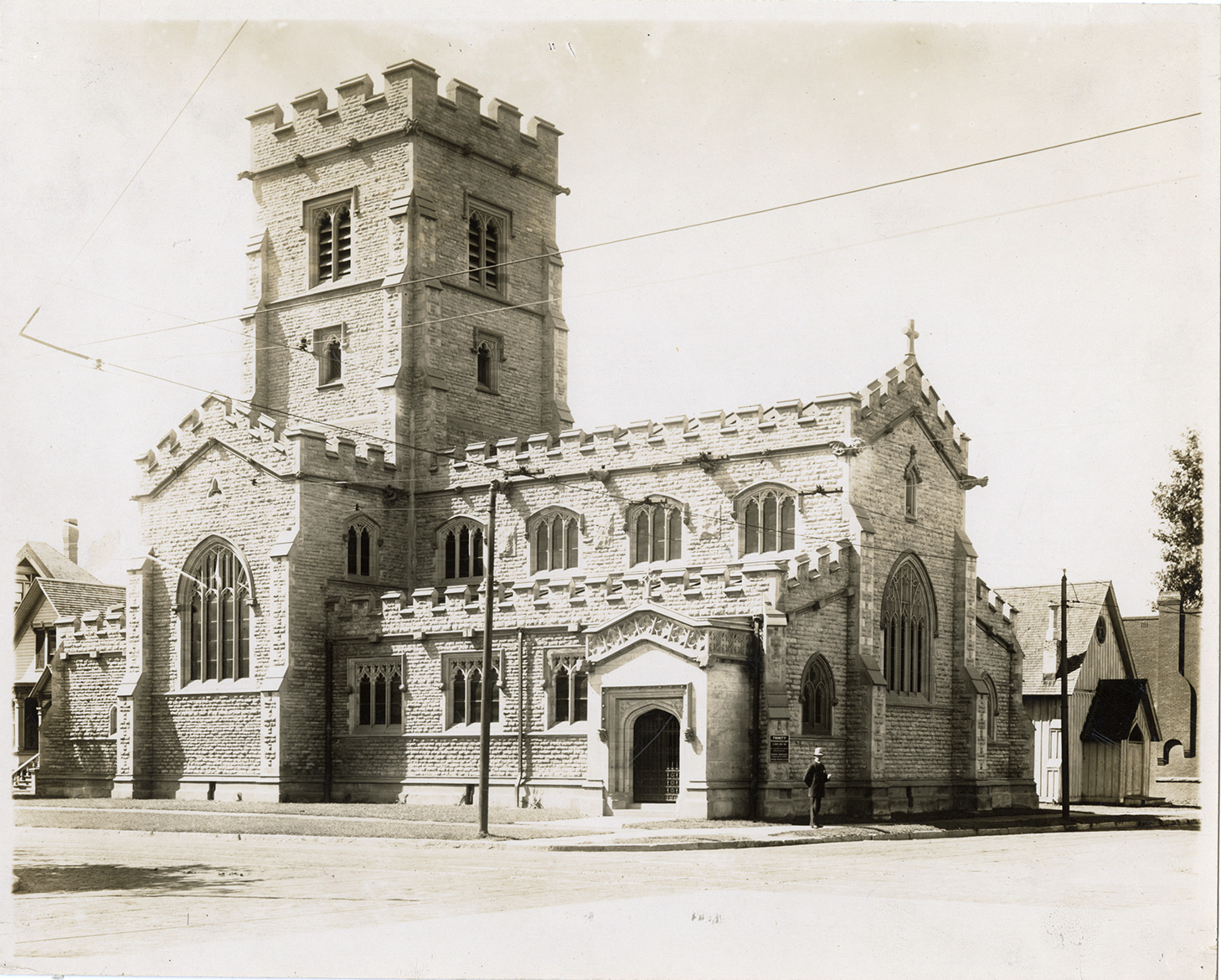 View of the Trinity Protestant Episcopal Church. Policeman on corner. Handwritten on back: "Church, Trumbull & Myrtle."