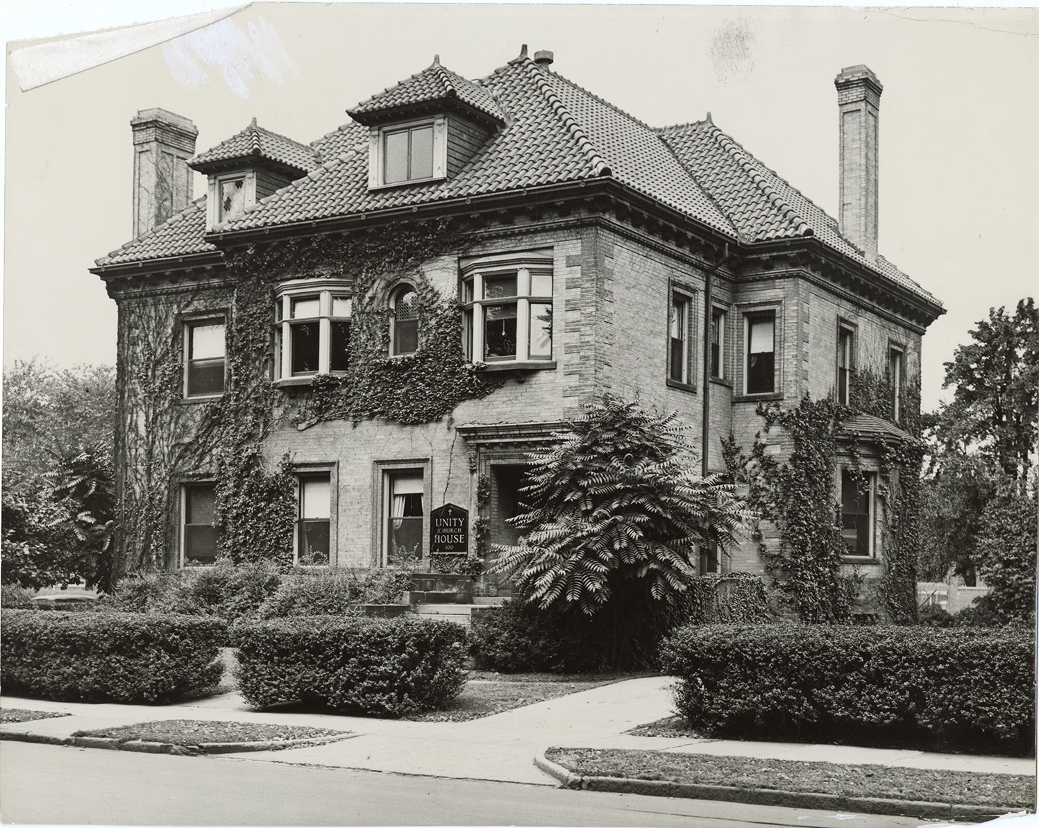 Favorite this☆ Unity Church Description: View of the Unity Church House. Two-story brick building has bay windows, tile roof and roof dormers. Sign next to entrance reads: "Unity Church House, 100." Handwritten on back: "Unity Church House, 100 West Kirby Ave." Details Resource ID: bh029828 Subject: Church buildings--Michigan--Detroit Photographic prints Date Issued: 1933 (year approximate) Format: 1 photographic print ; 8 x 10 in. Member of: Burton Historical Collection Filing Location: D/Churches-Misc.-Unity Rights: Physical rights are retained by DPL. Copyright is retained in accordance with U.S. copyright laws.