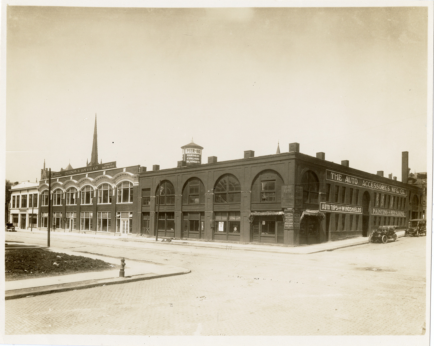 View of the Pierson & Hough Co. building adjacent to the Auto Accessories Manufacturing Co. Sign on water tower reads: "Peer-Ho, harness, collars, blankets." Handwritten on back: "Pierson & Hough Co."