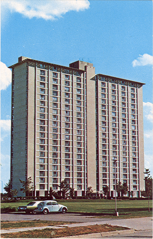 View of the Four Freedoms House. Printed on back: "Four Freedoms House, Detroit, Michigan. This senior citizens residence was sponsored by Trade Unions for Senior Americans. It is a 320 apartment high rise adjoining spacious Lafayette Park. It is within walking distance of downtown Detroit, Eastern Market and is near I-75. A large lounge is the center of activities for the residents. The architectural design and cultured landscaping make it one of the most beautiful senior citizens residence in Detroit. Aronsson Printing Company, Detroit, Mi."