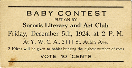 Ticket used to vote in a baby contest, presented by the Sorosis Literary and Art Club. Printed on front: "Baby contest put on by Sorosis Literary and Art Club, Friday, December 5th, 1924 at 2 p.m. at Y.W.C.A., 2111 St. Aubin Ave. 2 prizes will be given to babies bringing the highest number of votes. Vote 10 cents."