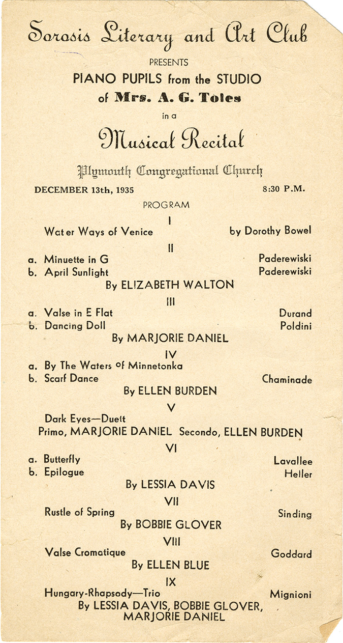 Musical recital presented by the Sorosis Literary and Art Club, featuring the piano pupils from the studio of Mrs. A.G. Toles. The program was held at the Plymouth Congregational Church on December 13, 1935.