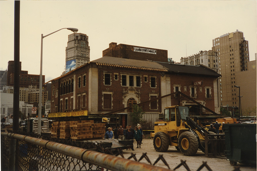 View of the relocation of the Gem Theater. Bulldozer or tractor in foreground. "Residential Chimney, expert house movers" is painted on beam. Printed on sleeve: "Gem Theater (moving of). Detroit, Wayne County, Michigan. Date: October, 1997."
