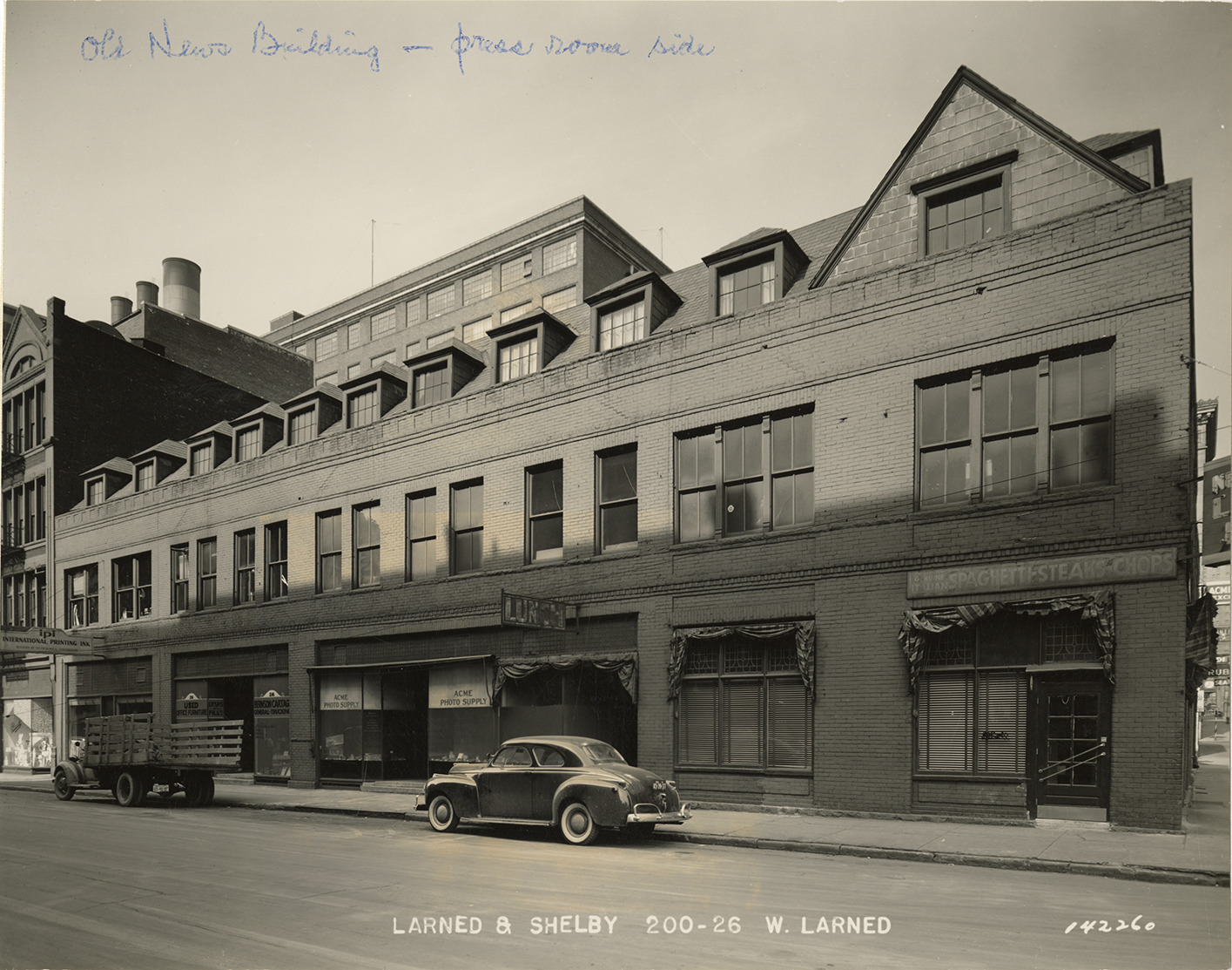 Favorite this☆ Commercial building at 200-226 West Larned Street Description: View of a commercial building located at 220-226 W. Larned St. Car and truck parked in street. "Acme photo supply" sign in window. Printed on front: "Larned & Shelby, 200-26 W. Larned." Handwritten on front: "Old News building, press room side." Details Resource ID: bh029877 Subject: Commercial buildings--Michigan--Detroit Streets--Michigan--Detroit Automobiles--Michigan--Detroit Photographic prints Date Issued: Unknown year Format: 1 photographic print mounted on fabric ; 7.5 x 9.5 in. Member of: Burton Historical Collection Filing Location: D/Streets-Larned Rights: Physical rights are retained by DPL. Copyright is retained in accordance with U.S. copyright laws.