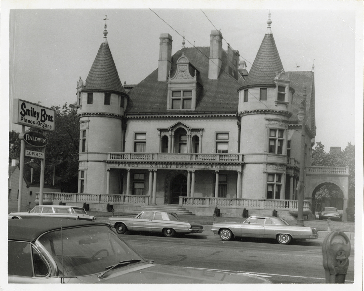 View of Smiley Brothers pianos and organs on Woodward Avenue. Cars parked in street. Chateauesque style building was formerly the residence of Frank J. Hecker, and designed by Louis Kamper. Stamped on back: "George Wilkinson, 10465 Kingston, Huntington Woods, Mich." Handwritten on back: "Original Col. Hooker [sic] residence on Woodward Ave. corner of Ferry Ave. Woodward, Detroit, June '65."