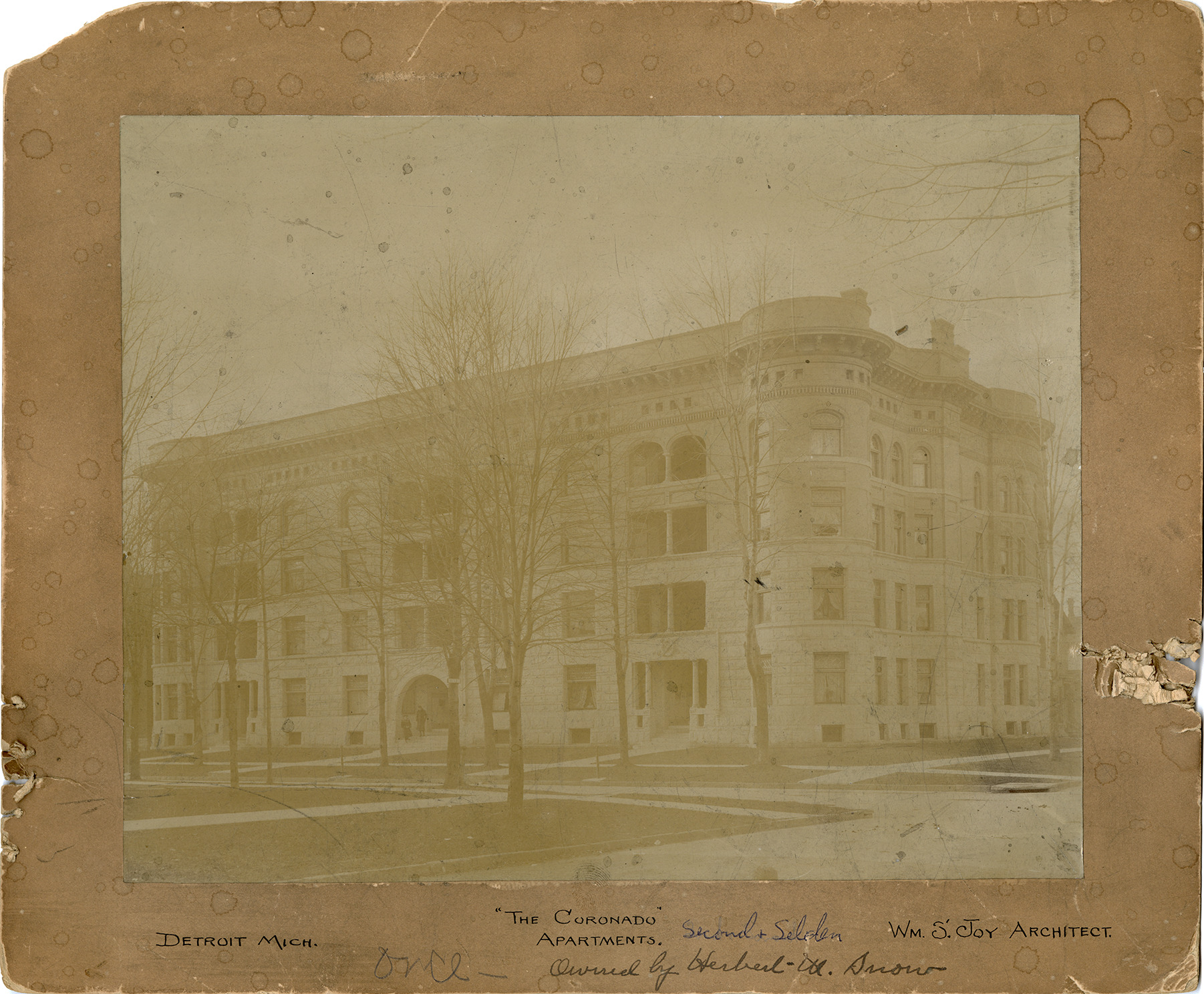 Favorite this☆ Coronado apartments Description: View of the Coronado apartment building. Handwritten on front: "The Coronado apartments, Second & Selden, Wm. S. Joy, architect. Detroit, Mich. Owned by Herbert W. Snow." Details Resource ID: bh029893 Subject: Apartment houses--Michigan--Detroit Photographic prints Date Issued: Unknown year Format: 1 photographic print mounted on mat board ; image 7.75 x 9.75 in. Member of: Burton Historical Collection Filing Location: MS/Snow, Edward S., 2:16 Rights: Physical rights are retained by DPL. Copyright is retained in accordance with U.S. copyright laws.