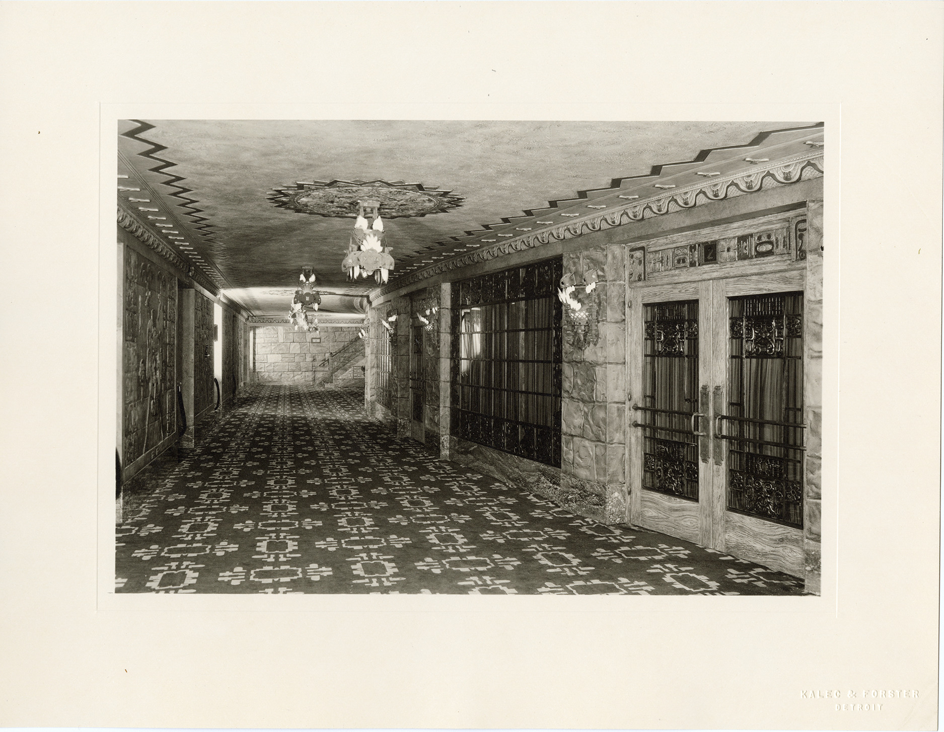 View of a lobby in the Fisher Theatre, showing doors, decorative walls and carpeting. Staircase visible in background. The interior decoration of the Fisher Theatre was originally a Mayan Revival style, an adaptation of Mayan temples excavated in Central America. In 1961, the theater was completely remodeled. Embossed on front: "Kalec & Forster, Detroit."