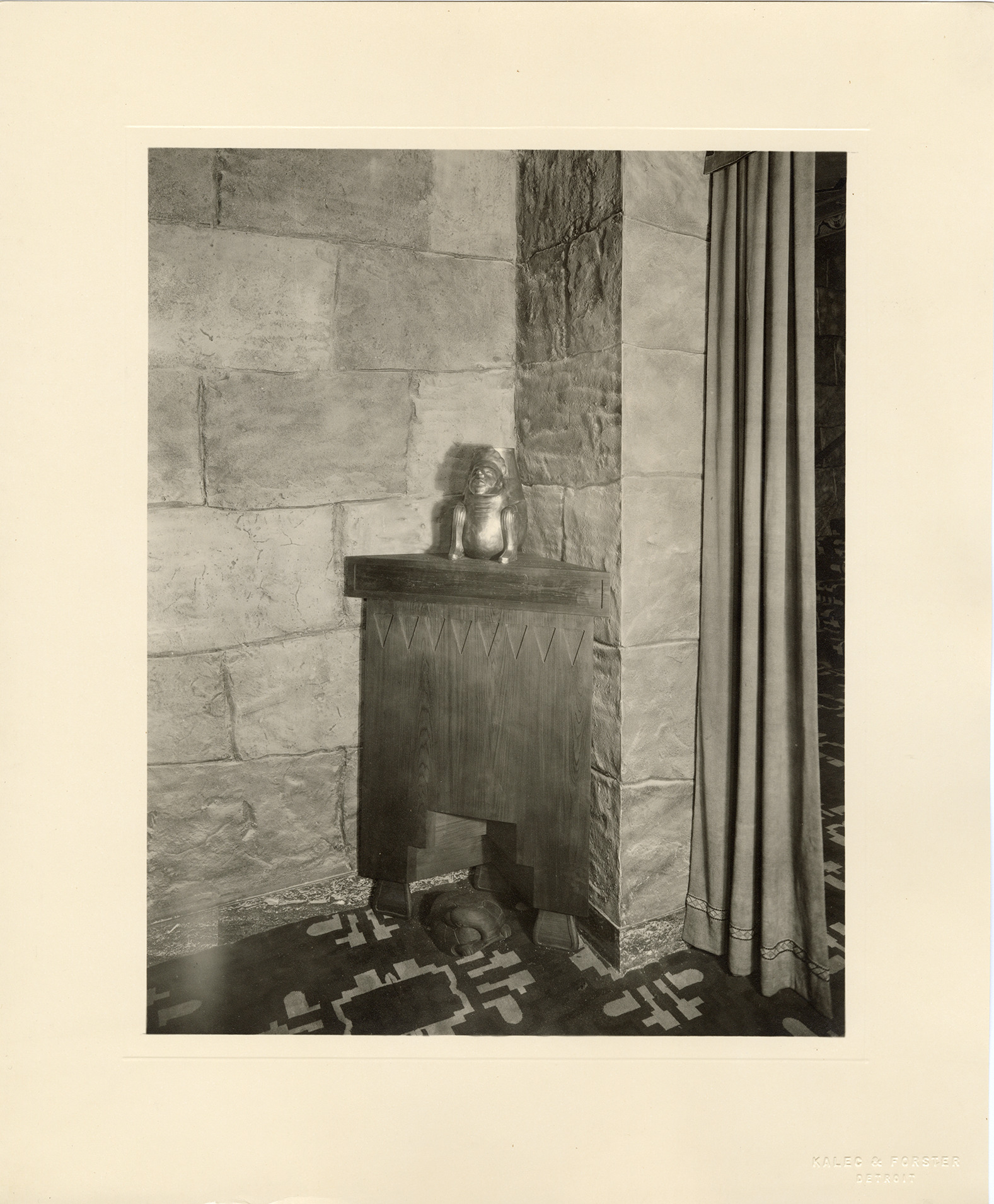 View of a sculpture on pedestal in niche at the Fisher Theatre. The interior decoration of the Fisher Theatre was originally a Mayan Revival style, an adaptation of Mayan temples excavated in Central America. In 1961, the theater was completely remodeled. Embossed on front: "Kalec & Forster, Detroit."