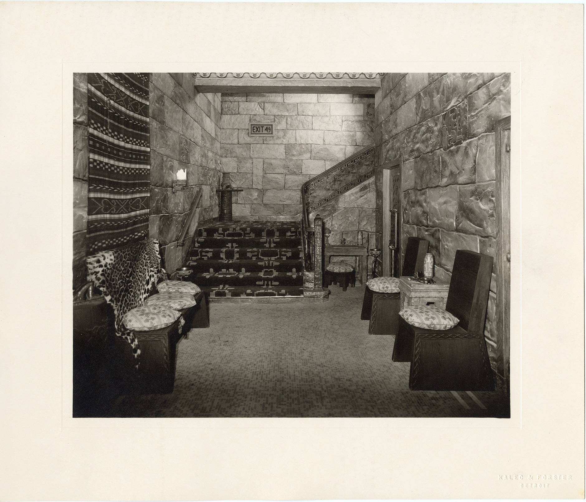 View of a staircase in the Fisher Theatre, showing decorative walls and carpeting. Chairs and sofa in foreground; "Exit 49" sign on wall in background. The interior decoration of the Fisher Theatre was originally a Mayan Revival style, an adaptation of Mayan temples excavated in Central America. In 1961, the theater was completely remodeled. Embossed on front: "Kalec & Forster, Detroit."