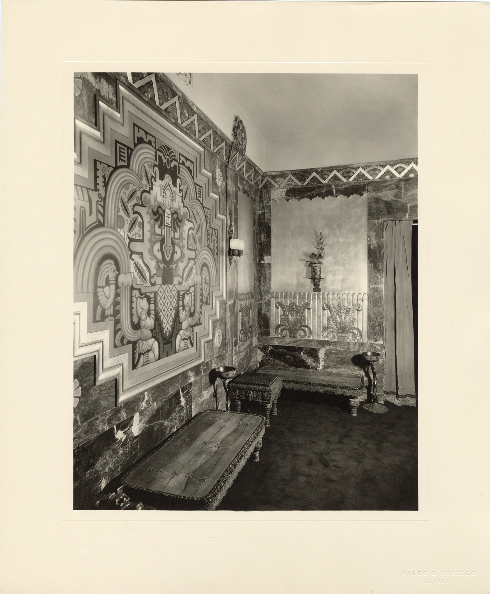 View of a sitting area in the Fisher Theatre, showing two benches and a decorative wall painting. The interior decoration of the Fisher Theatre was originally a Mayan Revival style, an adaptation of Mayan temples excavated in Central America. In 1961, the theater was completely remodeled. Embossed on front: "Kalec & Forster, Detroit."