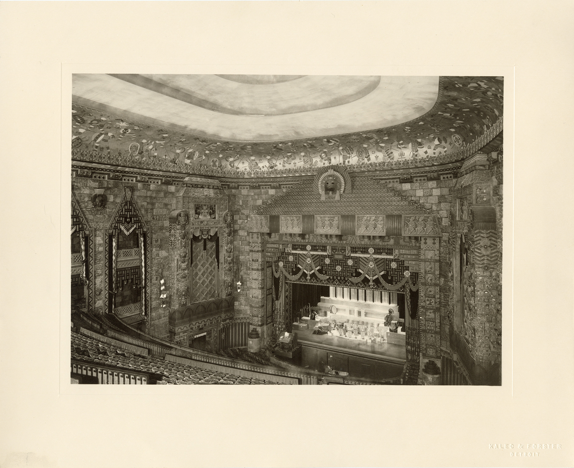 View from balcony of the auditorium in the Fisher Theatre. The interior decoration of the Fisher Theatre was originally a Mayan Revival style, an adaptation of Mayan temples excavated in Central America. In 1961, the theater was completely remodeled. Embossed on front: "Kalec & Forster, Detroit."
