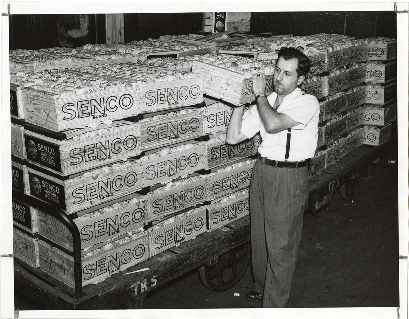 Favorite this☆ Man with crates of tomatoes, Detroit Union Produce Terminal Description: View of a man with crates of Senco brand tomatoes at the Detroit Union Produce Terminal. Details Resource ID: bh029939 Subject: Terminals--Transportation--Michigan--Detroit Farm produce--Transportation--Michigan--Detroit Tomatoes--Michigan--Detroit Photographic prints Date Issued: 1941 (year approximate) Format: 1 photographic print ; 7 x 9 in. Member of: Burton Historical Collection Filing Location: D/Industries and business houses-Detroit Union Produce Terminal Rights: Physical rights are retained by DPL. Copyright is retained in accordance with U.S. copyright laws.