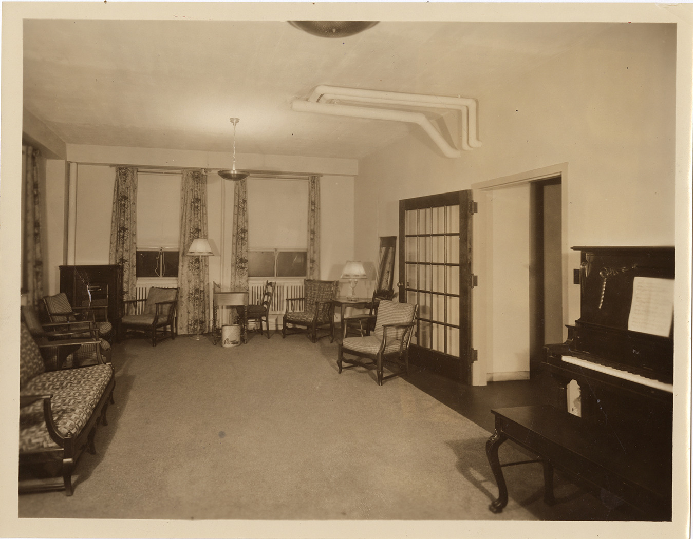View of employee lounge at the Florence Crittenton Hospital. Room is furnished with chairs, sofa and piano. Label on back: "Lounge for women of shops and office employees." Stamped on back: "When reproduced kindly give credit to D.D. Spellman, photographer, Deroit [sic]" and "Free Press." Handwritten on back: "Florence Crittenton home."