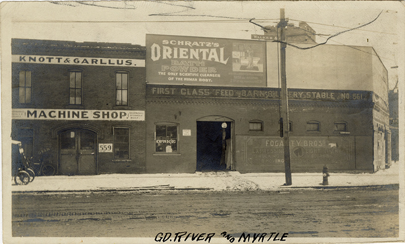View of the John Fogarty livery. Sign on building reads: "First class feed, barn, livery, stable, no. 561." Adjacent to Knott & Garllus Machine Shop. Billboard for Schratz's Oriental bath powder is displayed on building. Prints on front: "Gd. River and Myrtle." Handwritten on back: "561 Grand River."