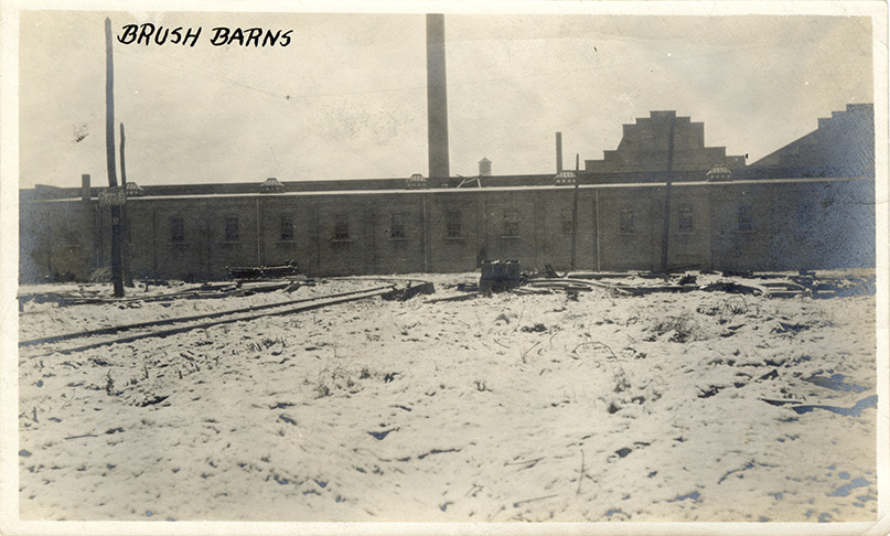 View of the Brush Street car barn for the Detroit United Railway. Handwritten on front: "Brush barns."