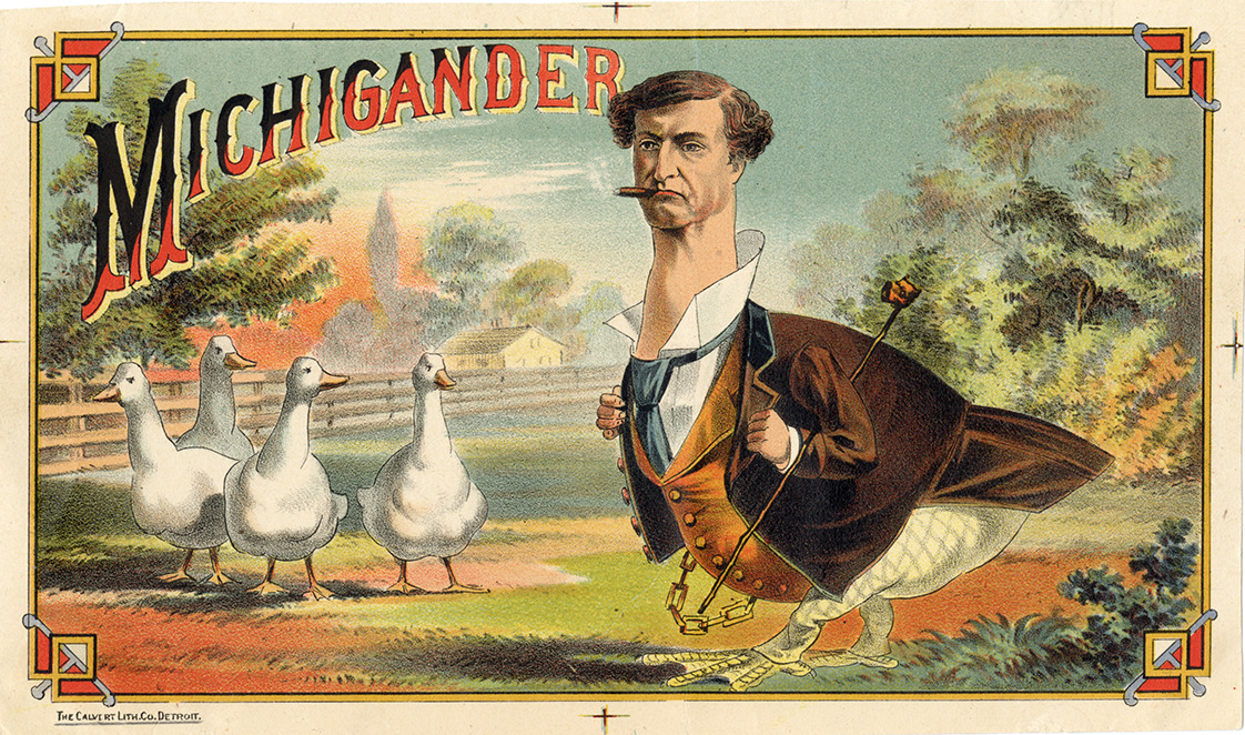Favorite this☆ Advertising card for the Michigander cigar Description: View of an advertising card for the Michigander cigar, depicting a man with the body of a goose, smoking a cigar. Four geese on left. Printed on front: "Michigander. The Calvert Lith. Co., Detroit." Details Resource ID: bh029988 Creator: Calvert Lithographing Co. (Detroit, Mich.) Subject: Cigar industry--Michigan--Detroit Advertising--Tobacco Men in advertising Men--Caricatures and cartoons Geese in art Advertising cards Date Issued: Unknown year Format: 1 advertising card : col. ; 4.5 x 7.5 in. Member of: Burton Historical Collection Filing Location: E&M 977.4D4 763 C13 Rights: Physical rights are retained by DPL. Copyright is retained in accordance with U.S. copyright laws.