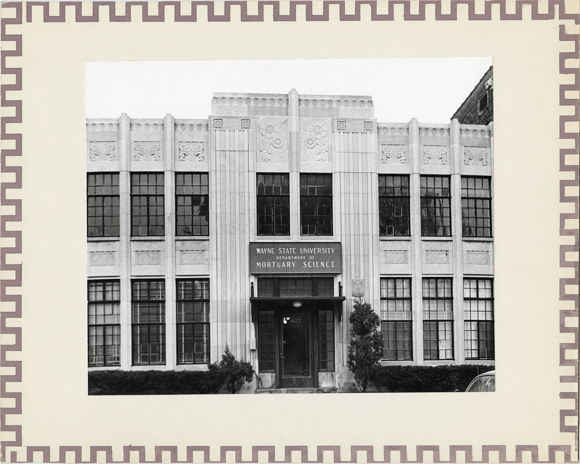 View of the Dept. of Mortuary Science building on the campus of Wayne State University. "Wayne State University, Department of Mortuary Science" sign is displayed over entrance.