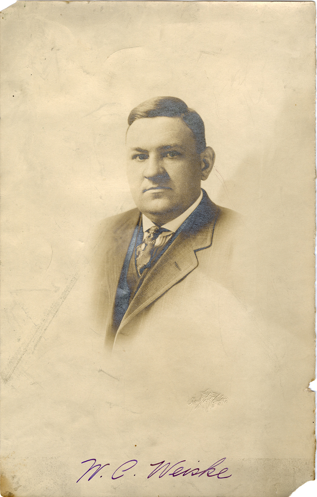 Portrait of William Charles Weiske. Embossed on front: "Frank Scott Clark." Handwritten on front: "W.C. Weiske." Handwritten on back: "Packard."
