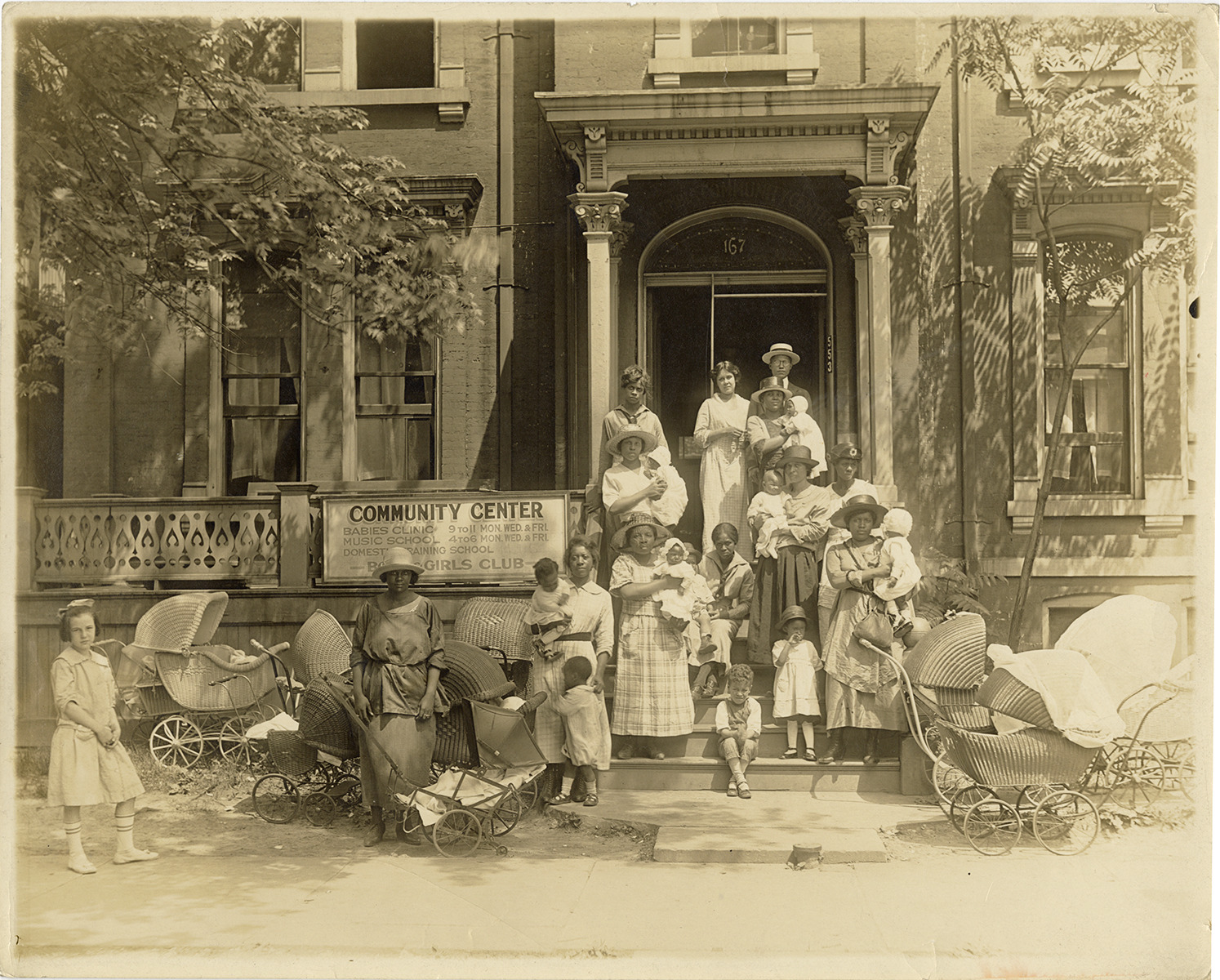 View of women and children posing in front of the first well baby clinic of the Detroit Urban League, located at 162 Columbia Street. Sign on porch railing reads: "Community Center. Babies Clinic, 9 to 11, Mon.-Wed. & Fri; Music School, 4 to 6, Mon.-Wed. & Fri; Domestic Training School. Boys & Girls Club." Baby carriages in foreground. Handwritten on back: "1921. On steps, Mr. and Mrs. John C. Dancy. 162 Columbia Street."